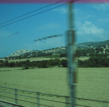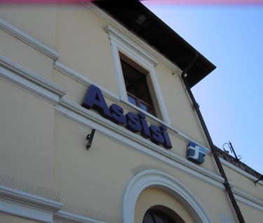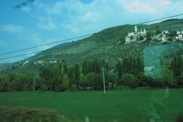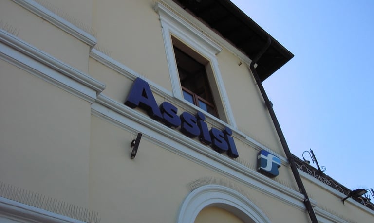 Dengan Kereta Api Regional, kota berpenduduk sekitar dua puluh tujuh ribu jiwa itu dapat ditempuh dalam waktu kurang lebih dua jam tiga puluh menit dari Stasion Termini, Roma. Kereta api melaju menyusuri lembah diantara perbukitan dan berhenti sebentar di setiap stasion kecil; seperti Orte, Nera Montoro, suatu daerah pertanian dengan tanaman jagung dan berbagai jenis sayuran. (Tanaman jagung, sayuran seperti bit, kentang, bawang, sejenis wortel juga banyak ditemukan di daerah pertanian luas antara Schiphol dan Huijbergen Belanda); kemudian Narni, Terni yang letaknya berdekatan; dengan rumah-rumah penduduk di perbukitan. Sebagian wilayah ini mirip-mirip pegunungan di Nagekeo daerah Flores. Stasion selanjutnya Giuncano (baca:”Gianco”), Spoleto, Spello, Tervi kemudian Foligno. Beberapa kali terlihat dari jendela kereta, tanaman anggur di wilayah antara Spoleto dan Spello. Itu beberapa tempat yang sempat terlihat dan tercatat dari tempat duduk dalam kereta api yang melaju, beberapa kali diluar terlihat gelap karena melalui terowongan bawah tanah; kota-kota lain terlepas dari pengamatan atau tak terpantau. Sebelum terminal akhir dari rute perjalanan hari itu jum’at, 23 September 2011; tampak di arah sebelah kanan deretan bangunan, rapi tertata di lereng sebuah bukit, dengan beberapa menara menjulang melebihi rata-rata ketinggian bangunan. “Itu kota Assisi”, begitu br. Eduard Quint, memberitahu. Tidak lama kemudian dari balik jendela kereta; terbaca kata Assisi. Stazione Assisi. Sebagian penumpang; laki-laki, perempuan, remaja, paruh baya; dengan ransel di punggung turun di stasiun ini.